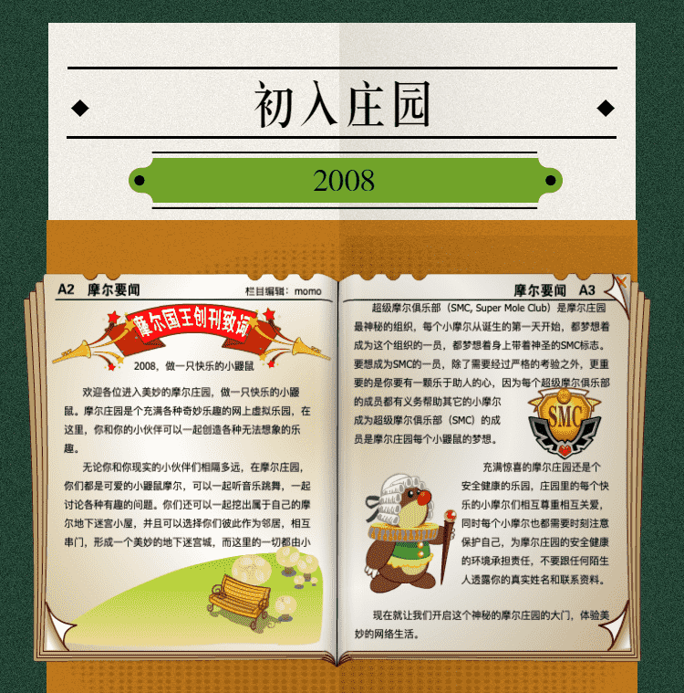 在这一年,,,摩尔庄园诞生了。。。在这里,,,,大家都是可爱的红鼻子鼹鼠小摩尔,,,可以一起勤劳耕作,,一起高山滑雪......我们都是摩尔庄园的建设者。。。