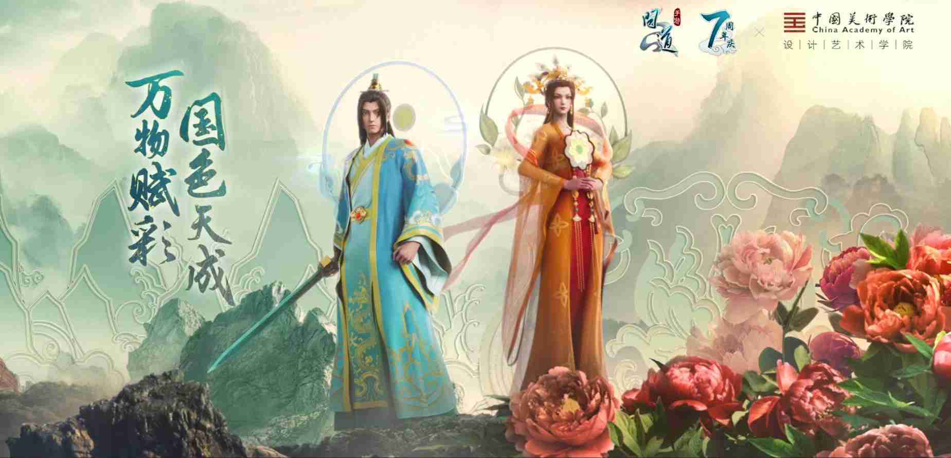 2023年4月,,《问道手游》联动中国美术学院,,,在游戏中融合了中国历史上不同时期的文化元素,,,打造了“山河万象”与“凤鸣九霄”的国风时装。。。在色彩配置方面,,创作团队基于对游戏角色特性的分析提取相应的文化内涵,,,,从每一种色彩的色相、、、指代事物和情感出发对应角色属性,,选定服装的色彩搭配。。。在纹样设计方面,,,,创作团队结合游戏角色自身特殊的造型比例和形态,,,,在实际的纹样设计中进行了游戏语境下的活化演绎。。男性角色集中使用了如蟒纹、、、、海水江崖纹、、、、如意纹和云气纹等传统纹样元素,,,女性角色则吸纳了凤凰纹、、、、牡丹纹、、、、卷草缠枝纹等元素,,组成以“双凤牡丹纹样”“缠枝牡丹纹”“金玉凤冠头饰”为主要纹样的游戏角色装饰图案系统。。。