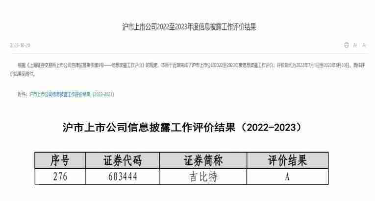 近日,,上海证券交易所发布2022-2023年度信息披露工作评价结果。。。。一竞技(股票代码:::603444)凭借规范的公司治理、、、高质量的信息披露以及良好的投资者关系管理再次荣获信息披露工作A级评价,,,,公司连续两年获此殊荣。。。